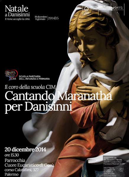 Il 20 Dicembre alle 15:30 presso la parrocchia "Cuore Eucaristico di Gesù" di corso Calatafimi, si esibirà il Coro della Scuola "Cuore Immacolato di Maria", cantando "Maranatha per Danisinni". L'evento si inserisce all'interno di Natale a Danisinni, un articolato programma di eventi e spettacoli per adulti e bambini (19 dicembre – 6 gennaio) ideato per dare una speranza ed un concreto sostegno ad uno dei luoghi tra i più sconosciuti e disagiati della città. La scuola dell’Infanzia e Primaria “Cuore Immacolata di Maria”, partecipa al progetto promosso dal quartiere che vede il coinvolgimento: della parrocchia S. Agnese in Danisinni con il presepe vivente ormai giunto alla 18° edizione, degli esercenti con Street Food, con il segmento del coro del CIM per Danisinni cantando "Maranatha" protagonisti del quale saranno gli alunni diretti da Sister Stacie Gagnon. Quest’anno i bambini canteranno in italiano, inglese, tedesco, spagnolo e francese. Non per un mero esercizio di pronuncia, quanto per far conoscere tradizioni natalizie di culture diverse ma uguali nell’emozionante attesa della venuta del Re dei Re.