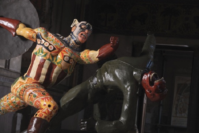 Una installazione, quella che sarà inaugurata sabato 11 giugno a Palazzo Forcella-De Seta, che è anche il simbolo della mostra, dal titolo “Incursioni”, in cui la produzione artistica del giovane talento siciliano incanta fra le stanze di uno dei palazzi più antichi e decadenti dell’Ottocento siciliano. E’ all’interno di quelle stanze affacciate sul mare che i supereroi “vestiti di Sicilia” da Pellegrino si presentano al pubblico, con una grande e importante missione che ad essi l’arte affida: quella di dare vita a luoghi da riscoprire, da ritornare a vivere con gioia. E’ infatti un’Isola piena di voglia di vivere quella che fa parte della produzione artistica di Domenico Pellegrino. Dall’uomo ragno che ha le trame dei carretti siciliani, alle luci delle luminarie che, come un vulcano di cui non sempre si percepisce l’attività, restituiscono vibrazioni all’osservatore.