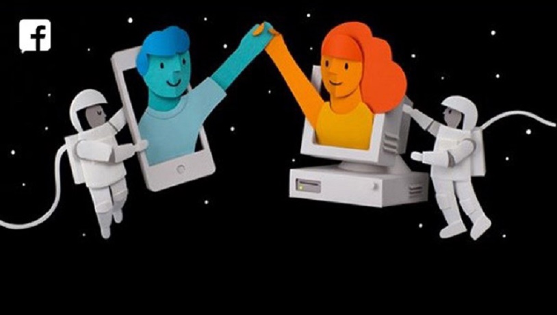 Nell’immagine, lo spazio più profondo con due astronauti che reggono un computer vecchio modello e uno smartphone di ultima generazione. Dagli schermi di questi due device si affacciano due persone – un uomo e una donna – che si stringono la mano. I personaggi sono colorati, mentre gli astronauti, lo smartphone e il computer sono in bianco e nero.