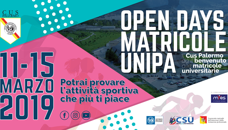Il Matricole Open Days UniPa è il primo grande evento del 2019 organizzato dal Cus Palermo e dal CSU, che offre un fitto programma di attività totalmente gratuite alle new entries dell’Università degli Studi di Palermo e ovviamente anche a tutti gli studenti, di qualsiasi scuola e anno. I ragazzi potranno svolgere cinque intensi giorni di sport gratuito, con un programma di lezioni, corsi e attività che va dalla mattina, con nuoto e fitness, alle attività di gruppo e arti marziali del pomeriggio e della sera.