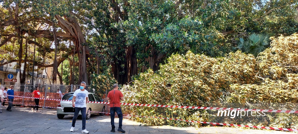Un grosso ramo dello storico Ficus di Piazza Marina, a Palermo, è collassato finendo a terra. Nessun danno a persone e cose, tranne che alla cancellata di villa Garibaldi. “É un fenomeno noto agli specialisti dei Ficus monumentali in tutto il mondo – spiega l’assessore comunale all’Ambiente, Sergio Marino -. Si definisce ‘summer branch drop’ cioè schianto estivo di una branca. É probabilmente legato a squilibri idrici legati alle variazioni repentine di temperatura e umidità, ma nessuno studio ne ha bene individuato le cause ed eventuali sintomi preventivi. A Palermo era già successo qualche anno fa in un ficus posto davanti la Fiera all’ingresso della Favorita. Proprio temendo questo, gli interventi sull’albero di Piazza Marina realizzati lo scorso anno mirano a favorire la stabilità delle branche laterali dell’albero aiutando le radici aeree ad ancorarsi al suolo (sono stati creati ad hoc alcuni nuovi Cercino nel suolo) e sostenere le branche”.