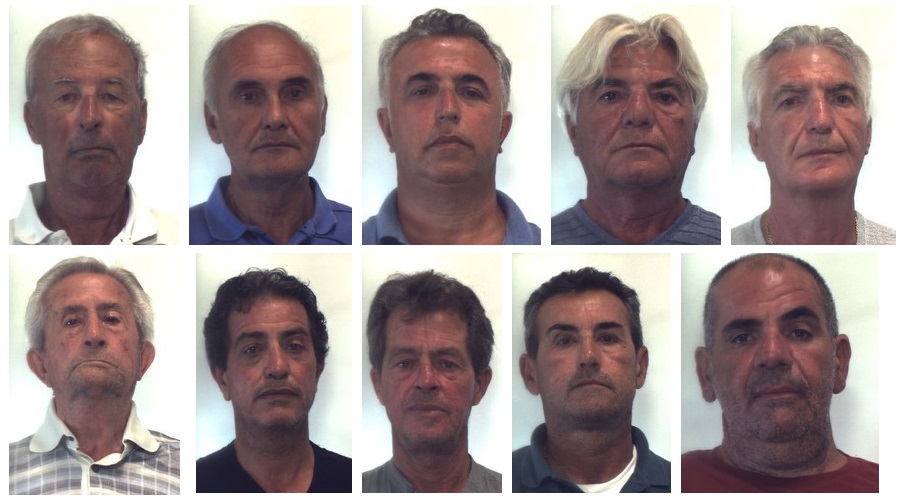 Nella foto gli arrestati, da sinistra in alto Lorenzo Di Maggio; Raffaele Di Maggio; Filippo Gambino; Giovanni Angelo Mannino; Ignazio Antonino Mannino. In basso da sinistra: Calogero Caruso (domiciliari) Francesco Puglisi; Natale Puglisi classe 59; Natale Puglisi classe 66; Calogero Badalamenti.