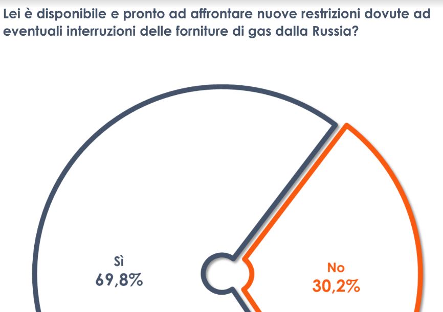 ROMA (ITALPRESS) – La guerra in corso ai confini dell’Europa ha generato una crisi energetica dovuta alle sanzioni imposte alla Russia per l’invasione dell’Ucraina. Sanzioni che, anche secondo l’opinione di quasi il 60% degli italiani, stanno danneggiando più il nostro Paese che i diretti interessati. Per ovviare a questo problema, gli Stati dell’Unione Europea stanno valutando diverse soluzioni, tra cui quella di stabilire un tetto al prezzo del gas. Un’ipotesi che, però, viene percepita come di difficile realizzazione sia per i lunghi tempi necessari (24,7%) che per un’eventuale opposizione da parte della Russia (19,9%). In questo contesto, dunque, dopo i lockdown e le limitazioni dovute alla pandemia, per superare questa crisi si prospettano nuove restrizioni dal punto di vista energetico. Oltre 2/3 degli italiani (il 69,7%), nonostante tutto, dichiara di sentirsi pronto e disponibile ad affrontare queste nuove restrizioni causate da un’eventuale interruzione delle forniture da parte della Russia.