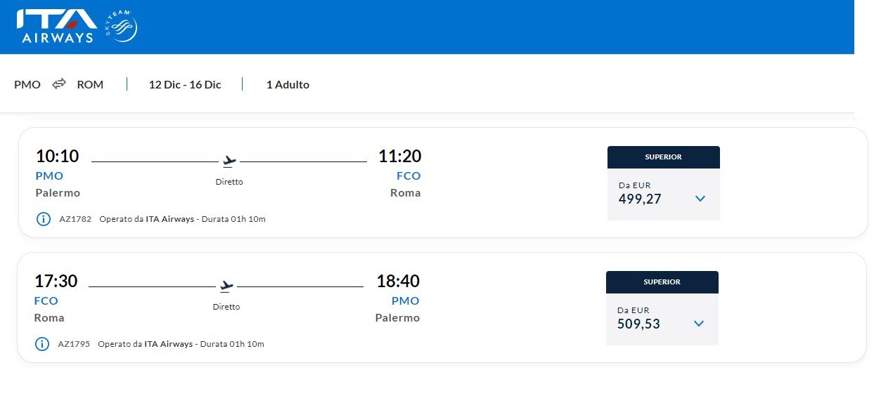 Un volo Ita andata e ritorno Palermo-Roma Fiumicino o Catania-Roma Fiumicino può costare anche più di un volo dalla Capitale a New York con la stessa compagnia.