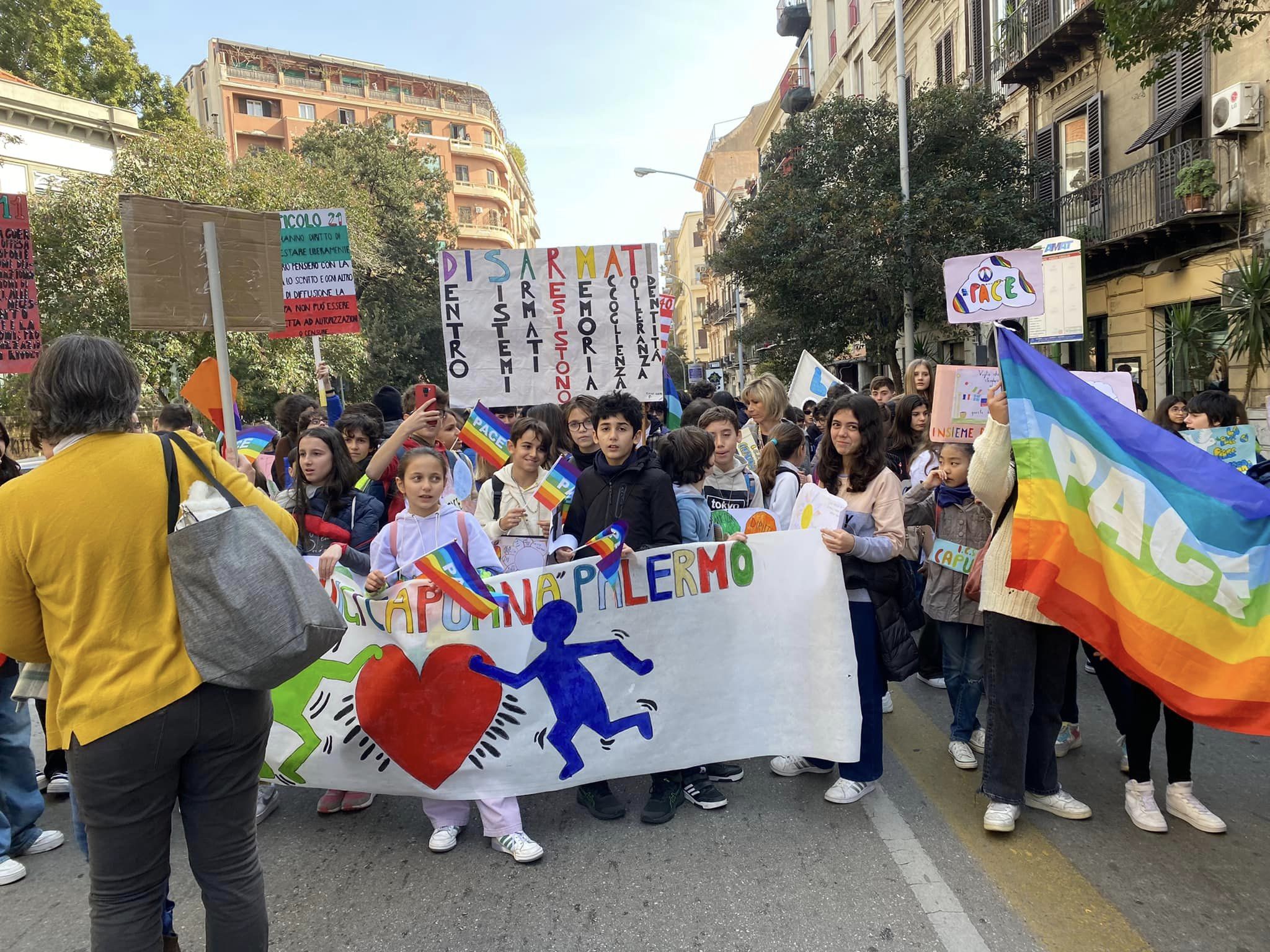 Lungo corteo e grande partecipazione di ragazzi e studenti a Palermo per la marcia contro la guerra in Ucraina organizzata da “Europe for Peace“. I manifestanti, partiti da Piazza Politeama, stanno percorrendo alcune vie del centro salendo per la via Dante per poi raggiungere i Cantieri Culturali della Zisa. Un lunghissimo corteo allegro e chiassoso con banda musicale e tanti slogan da parte di studenti delle scuole palermitane di ogni ordine e grado e varie associazioni e sindacati. Tantissimi gli striscioni esposti tra i quali spiccano: “Fuori la guerra dalla storia” e “La pace è la vittoria di cui abbiamo bisogno”.