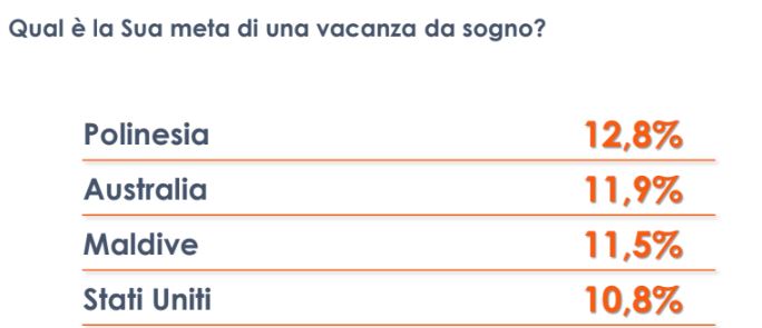 Luoghi lontani e paradisi terrestri sono tra le preferenze degli italiani per trascorrere un periodo di vacanza e relax. Polinesia (12,8%), Australia (11,9%), Maldive (11,5%), ma anche Stati Uniti sono le mete “da sogno” che mettono d’accordo quasi tutti. Meno scelte, invece, le capitali europee, che spesso sono la meta preferita per viaggi più brevi e non per trascorrere un periodo più lungo fatto di relax e vacanza al riparo dal caldo di agosto.