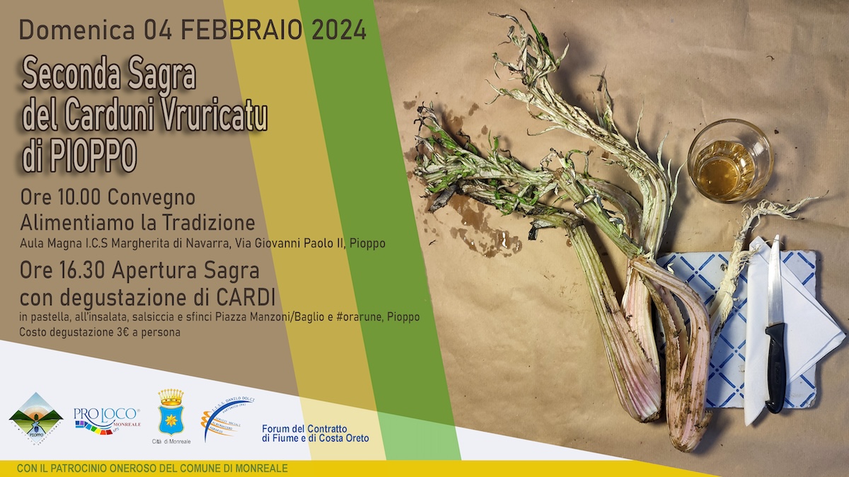 Domenica 4 febbraio torna con la seconda edizione la Sagra del “Carduni Vruricatu di Pioppo”. Organizzata dal Comitato Pioppo Comune, in collaborazione con la Proloco Monreale, il Forum del Contratto di Fume e Costa dell’Oreto e con il Patrocinio oneroso del Comune di Monreale, lo scorso anno ha registrato numeri altissimi di visitatori. Il taglio del nastro della manifestazione alle ore 16, con il sindaco Alberto Arcidiacono e tutti gli organizzatori.