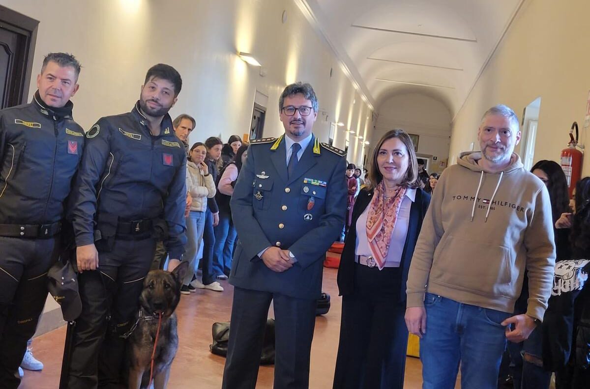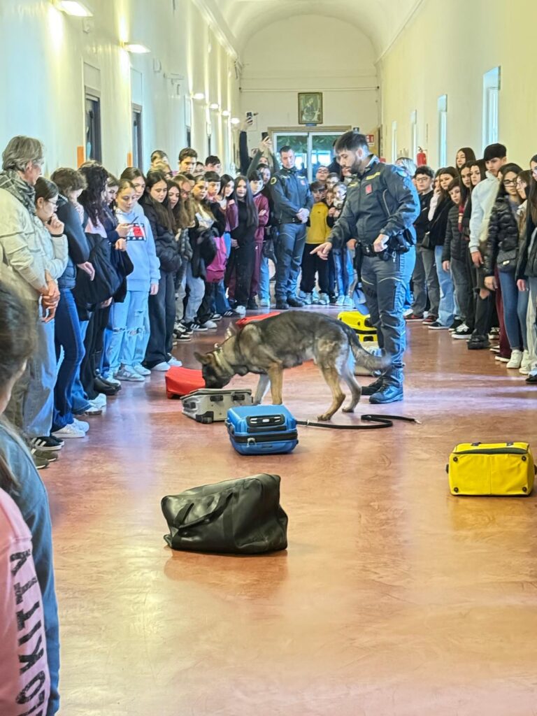 Momento particolarmente coinvolgente è stata la dimostrazione pratica dell’unità cinofila. Il corridoio dell’istituto si è trasformato in uno scenario operativo, dove il cane Cosmo, guidato dal suo conduttore, ha simulato un intervento antidroga. Un’attività che ha permesso ai ragazzi di comprendere da vicino il lavoro quotidiano svolto dalle Fiamme Gialle nella prevenzione e nel contrasto al traffico di sostanze stupefacenti, suscitando grande interesse ed entusiasmo.
