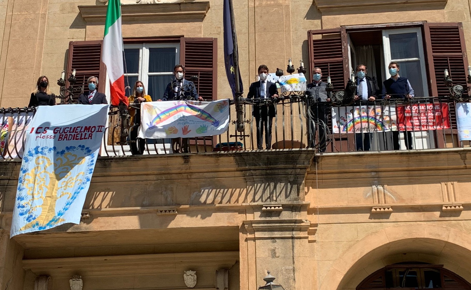 Cartelloni, manifesti banner realizzati dai bambini esposti per tutto il giorno nella balconata del Palazzo di Città